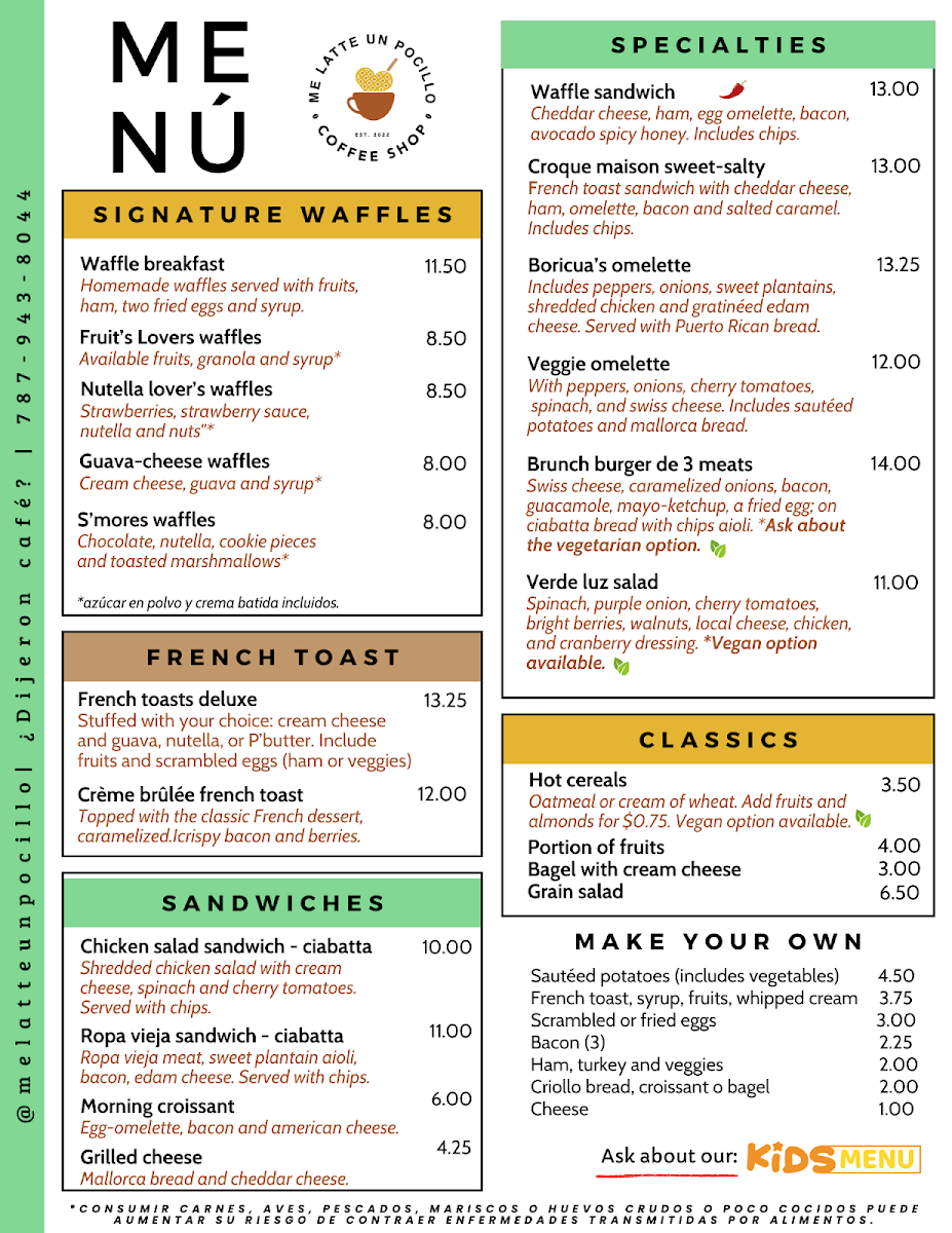 Welcome to Me latte un pocillo, a delightful café nestled in San Germán, Puerto Rico. Known for its warm ambiance and friendly service, this spot offers an impressive menu that caters to all tastes. Customers rave about the flavorful coffee—each cup is brewed to perfection, showcasing rich, bold notes that coffee aficionados will adore.